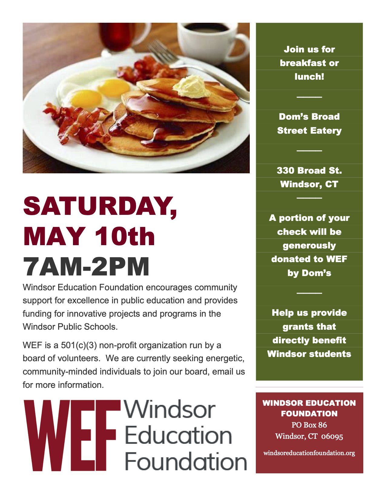 You can support WEF simply by eating at Dom’s Broad Street Eatery on Saturday, May 10th! Dom’s will donate a portion of their revenue that day to WEF!